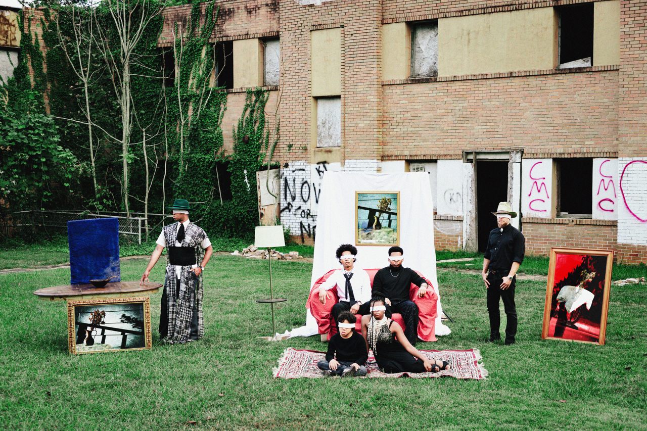 Four men with white blindfolds in an outdoor setting with a makeshift art installation that includes a sofa, a painting, and a rug, in front of a brick building with graffiti.